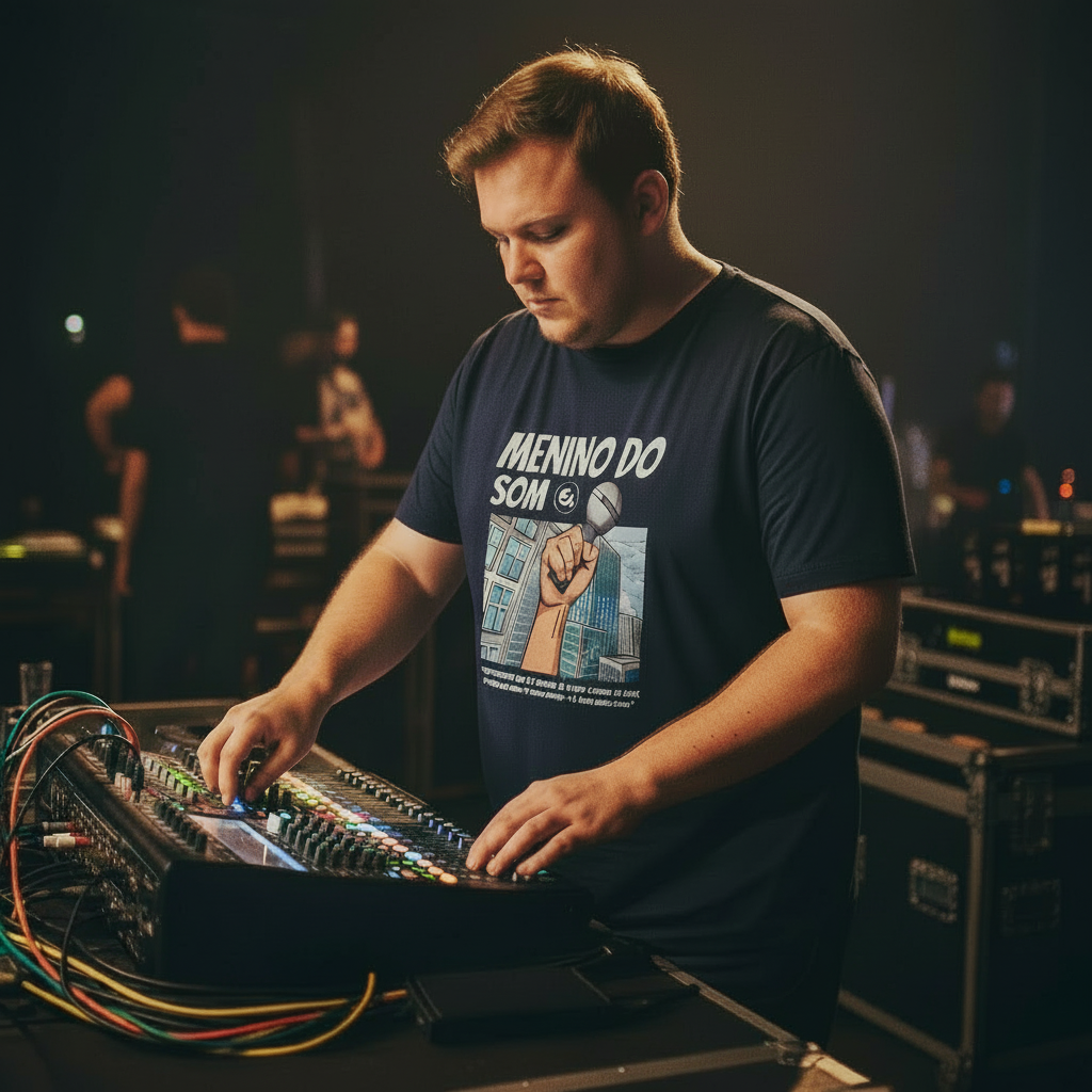 Lá vem ele, o menino do som, sempre pronto pra salvar o microfone, o retorno e o evento inteiro!
