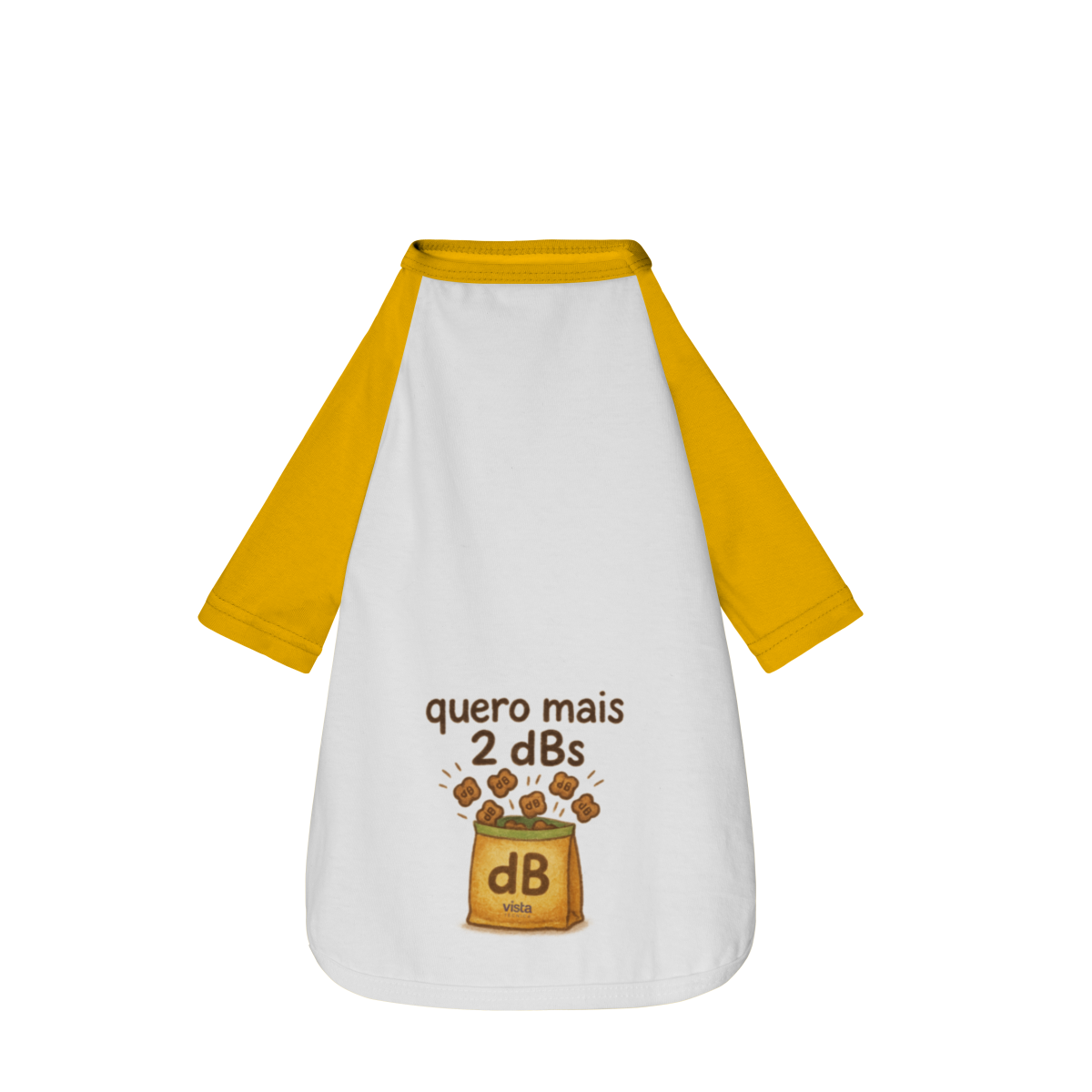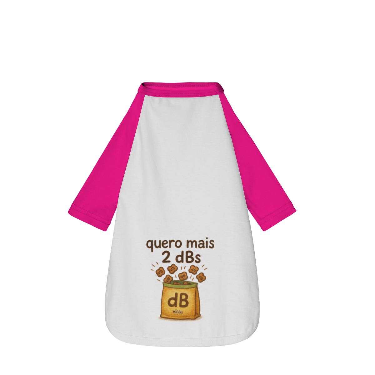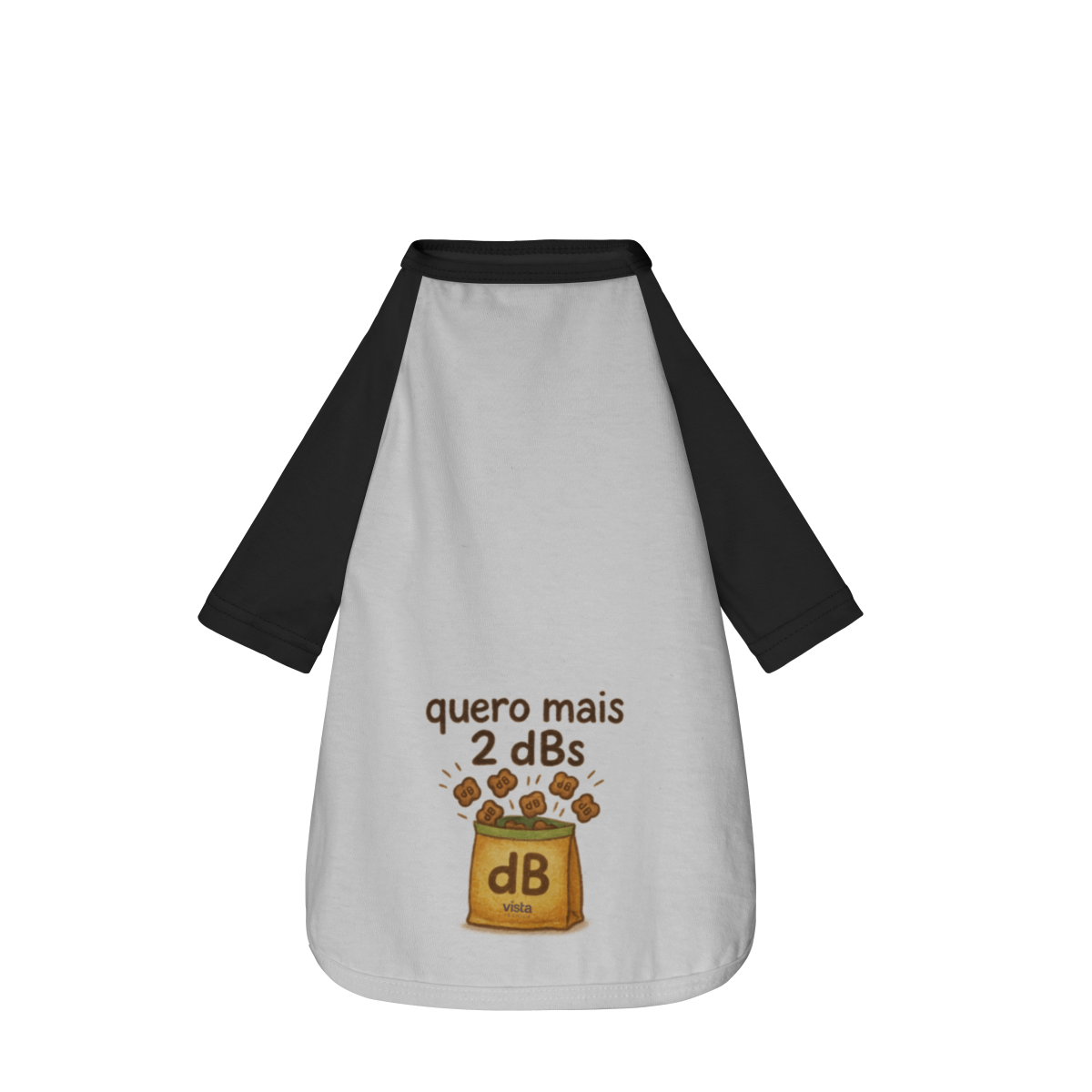 Nesta camiseta super divertida, a embalagem dos petiscos vem estilizada com a marca “dB” — porque, pra esse pet, a medida oficial de gostosura é em decibéis mesmo. E a frase “Quero mais dois dBs” diz exatamente o que ele pensa sempre que vê um pacotinho abrindo.