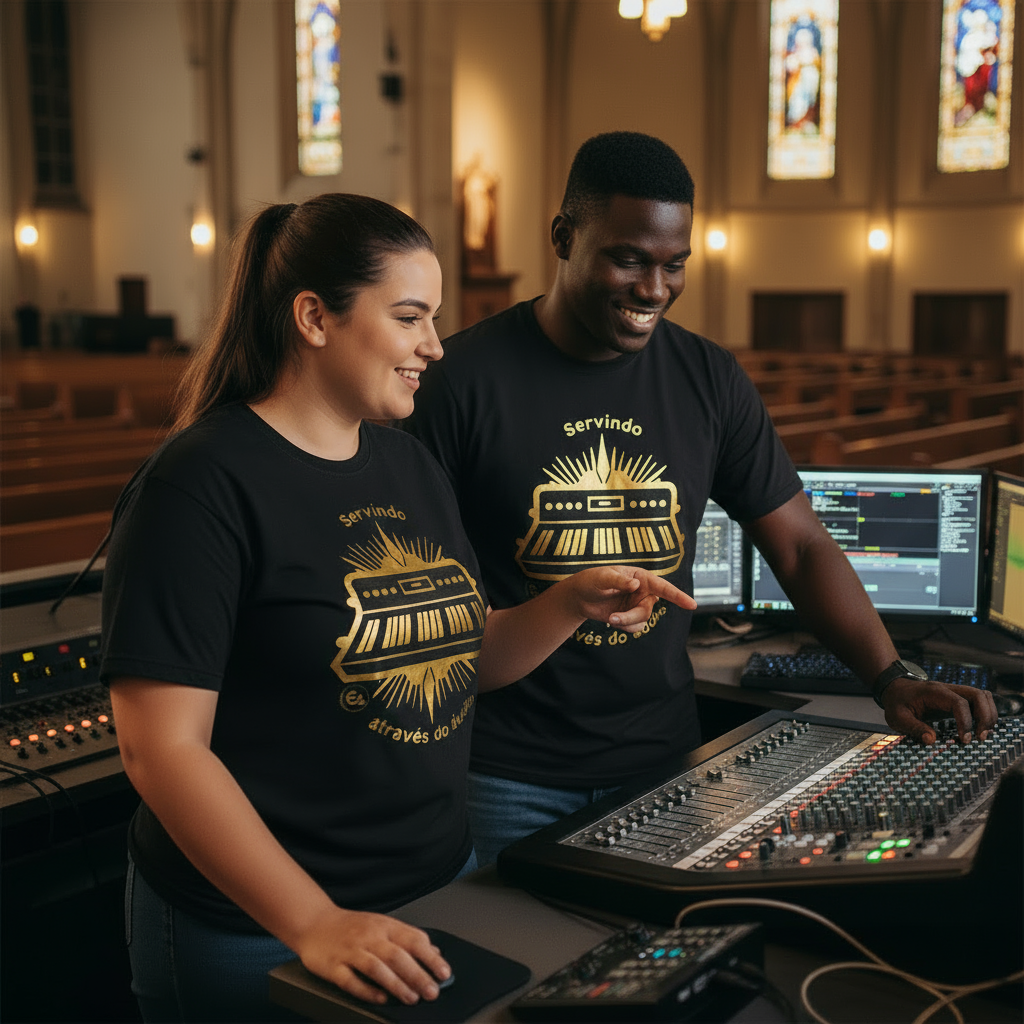 Porque cada som pode ser um ato de serviço. Essa camiseta foi feita pra quem entende que trabalhar com áudio na igreja é mais do que técnica — é ministério.
